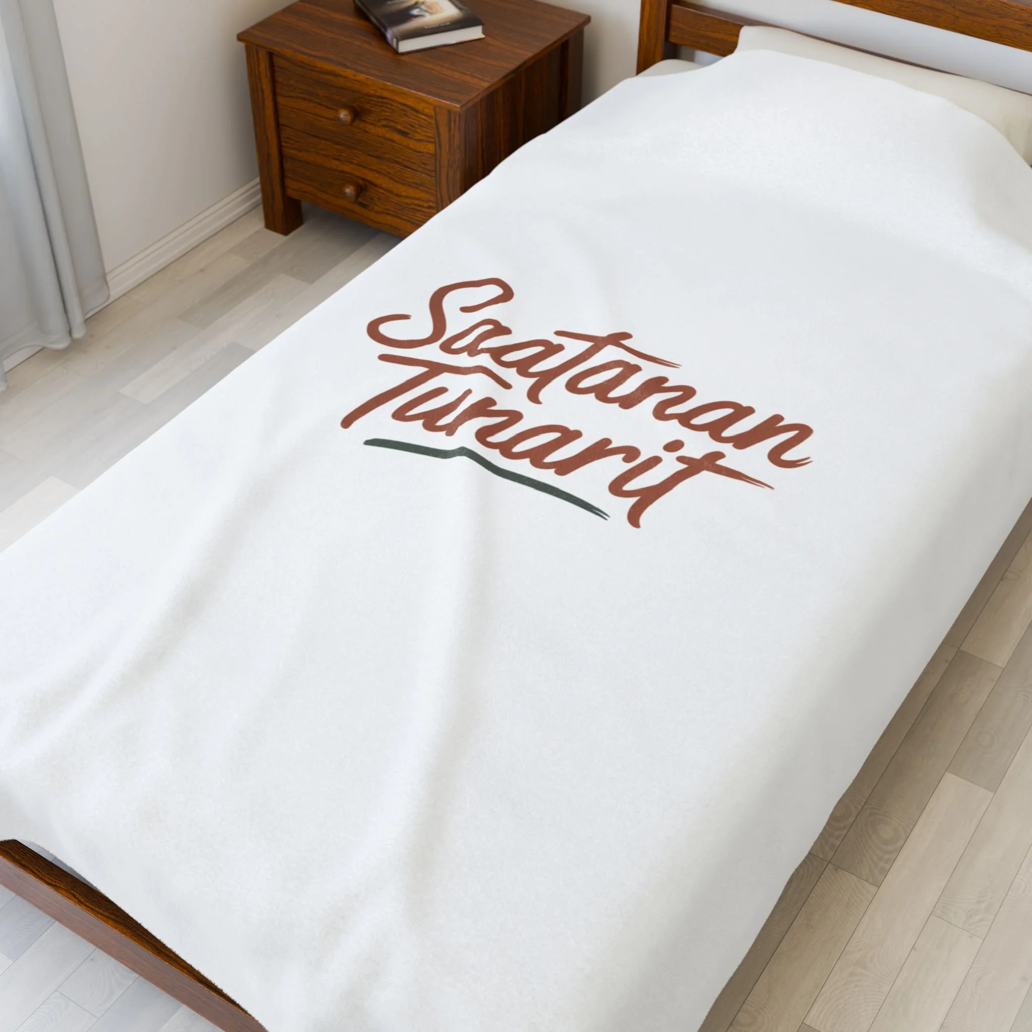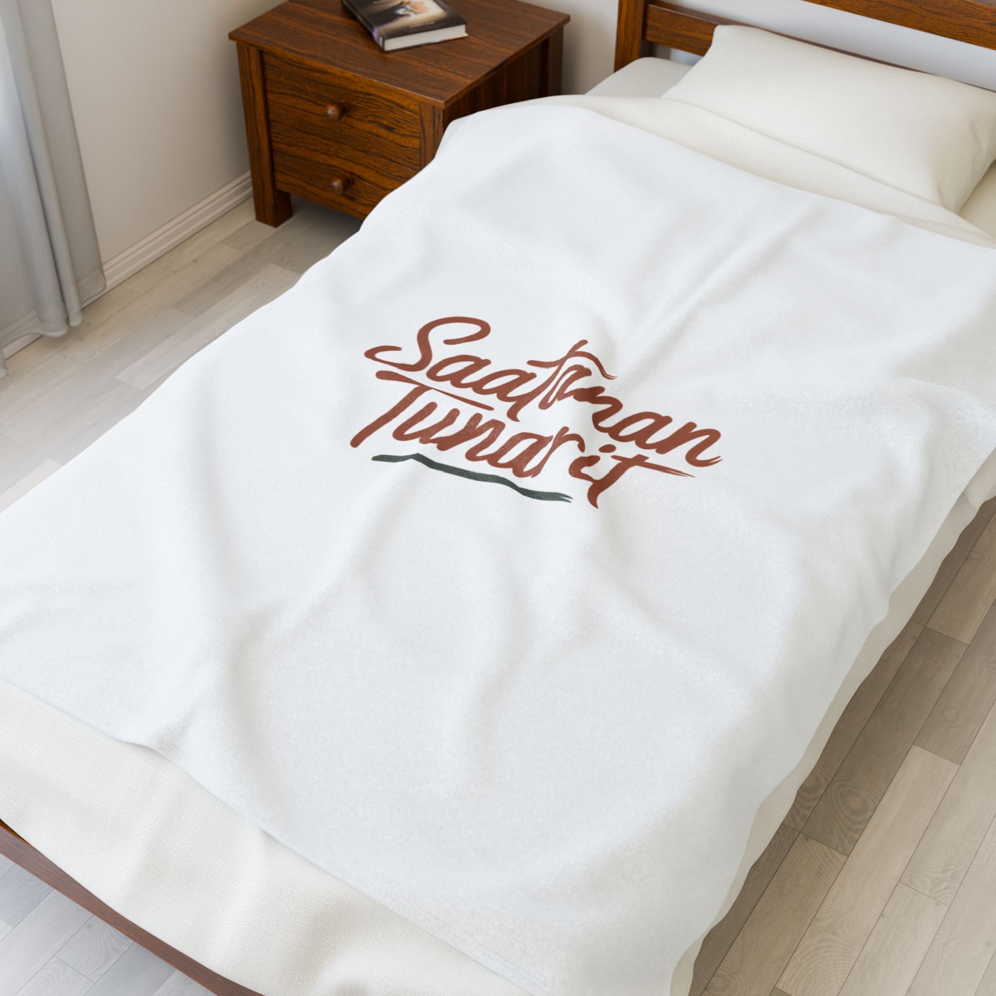 A soft, neutral-toned plush blanket featuring a clean, hand-lettered statement in warm rust and olive ink. The minimalist script sits centered with a subtle underline flourish, keeping the message-first aesthetic of hand-lettered quotes while maintaining a calm, modern palette. Lightweight but cozy, it layers easily on a sofa or reading chair and complements bookish, minimalist, or cozy decor where the typography is the focal point. Product features - Double needle topstitch on all seams - 100% polyester or 83% polyester / 17% spandex options - Print on one side in high detail and vibrant color - Medium heavy-weight fabric (8.85 oz/yd² / 300 g/m²) - Meets stated flammability and chemical compliance requirements Care instructions - Do not dryclean - Do not iron - Tumble dry: low heat - Do not bleach - Machine wash: cold (max 30C or 90F), *hand wash will extend the quality of the product